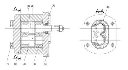 由Hidraulica UM Plopeni生產(chǎn)的齒輪電機(jī)幾乎與齒輪泵相同,主要由一對(duì)齒輪組成,(1)和(2),它們?cè)谟奢S承襯套(4)支撐的殼體(3)。蓋子(5)和法蘭(6)通過螺釘(7)與主體連接在一起。密封環(huán)(8)和旋轉(zhuǎn)箍(9)提供結(jié)構(gòu)的密封。