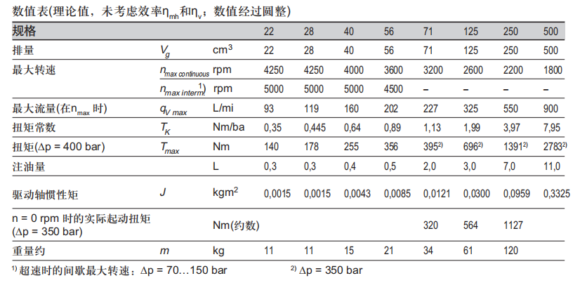 A4FM 電機(jī)有以下排量尺寸可供選擇:22 | 28 | 40 | 56 | 71 | 125 | 250 | 500 毫升/轉(zhuǎn)。標(biāo)稱(chēng)壓力為 350 bar,最大壓力為 400 bar。